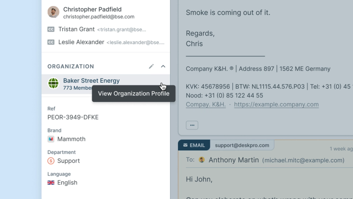 We've redesigned and improved the functionality of the Ticket Property's Organization field. Now, open or close a profile in the CRM panel by simply clicking on the field, just like User Profiles.
