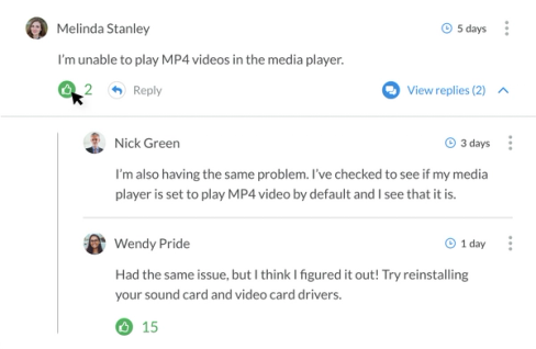 Customers can reply to content and other people as well as upvote comments deemed most valuable to discussions.