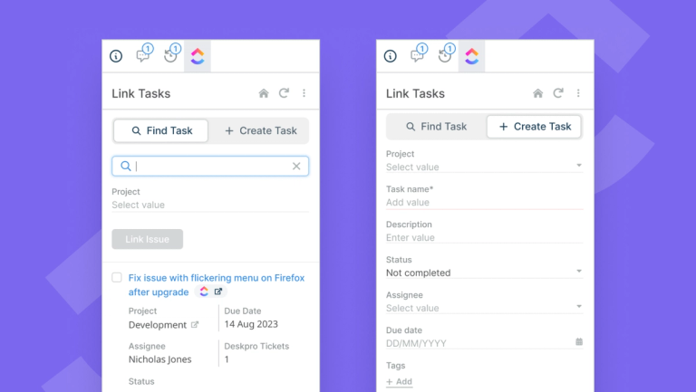 Link tasks to tickets: Linking tasks to tickets in our integration allows agents to view information from ClickUp while they are interacting with your users, making communication more efficient and easier.