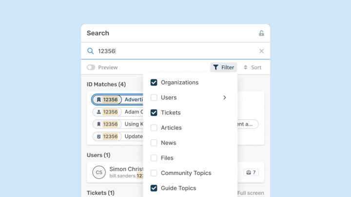 Filter Global Search against specific help desk items, like Tickets or Users, for the most relevant results.