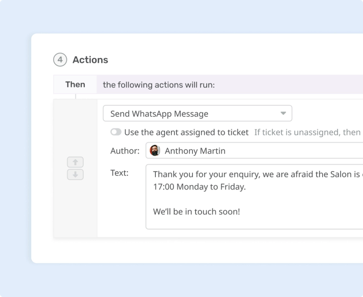 Create Triggers to automatically send a personalized WhatsApp message to users when a new ticket is created from an incoming WhatsApp message to offer a better customer experience.