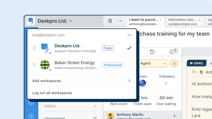 No more logging in and out repeatedly. With Linked Workspaces, everything is conveniently accessible directly from the Deskpro interface. Learn about Workspaces