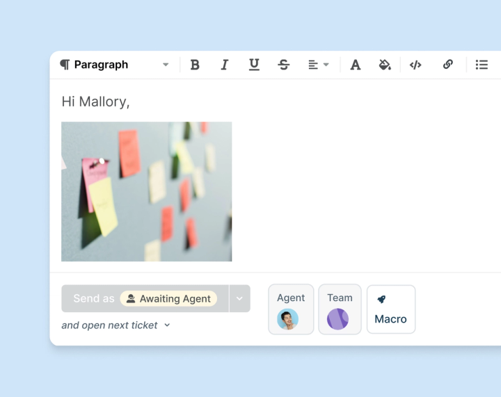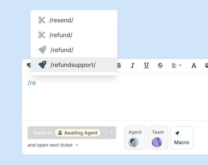 Just type the shortcode for your desired Macro, and it pops up as a suggestion in the reply box, just like Snippets. You then insert it with a single click and the Macro will queue up to run when you send your reply.