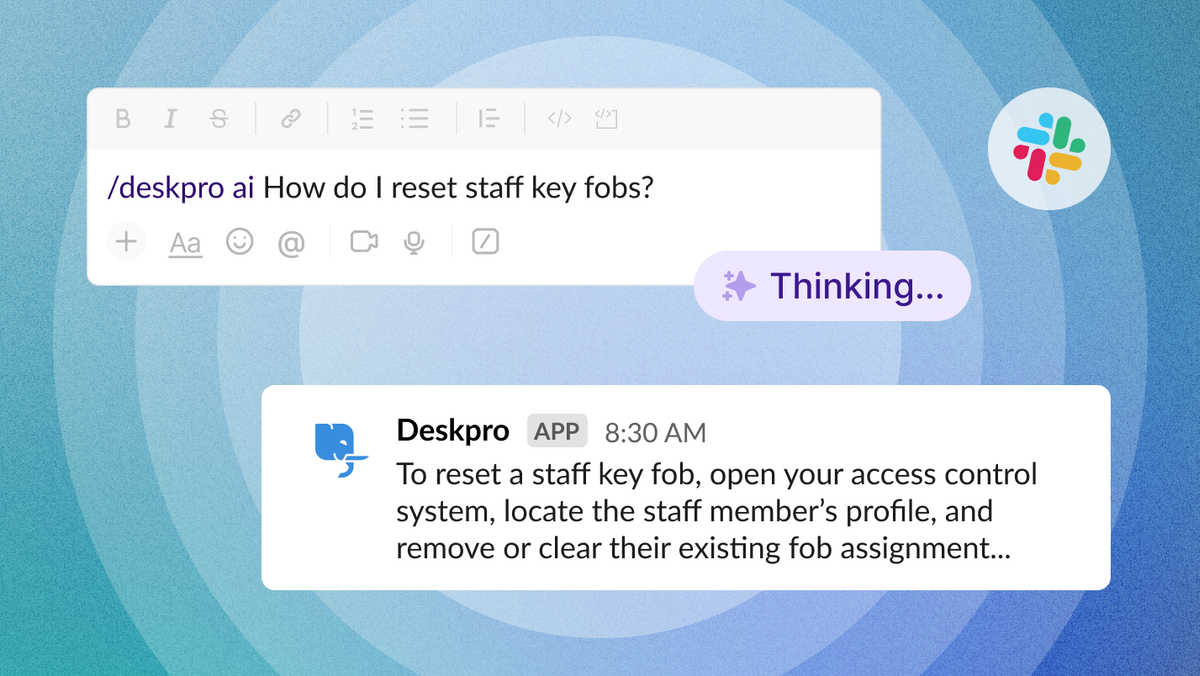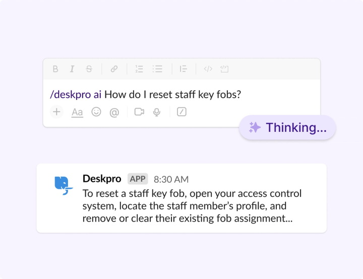 Use /deskpro ai for instant, in-thread answers powered by Deskpro AI, and let any of your team submit tickets directly in Slack. No Deskpro account required. Explore Deskpro in Slack