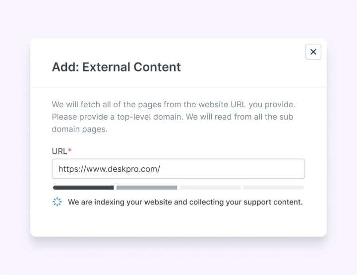 Connect Deskpro AI to trusted websites, knowledge bases, and PDFs.