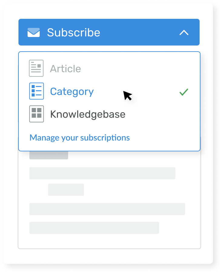 Subscriptions allow customers to be notified via email of any new articles, changes and updates to the knowledge base.