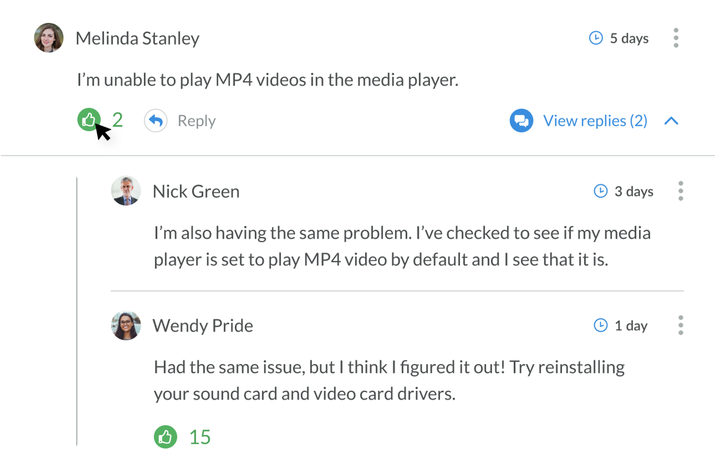 Customers can reply to content and other people as well as upvote comments deemed most valuable to discussions.