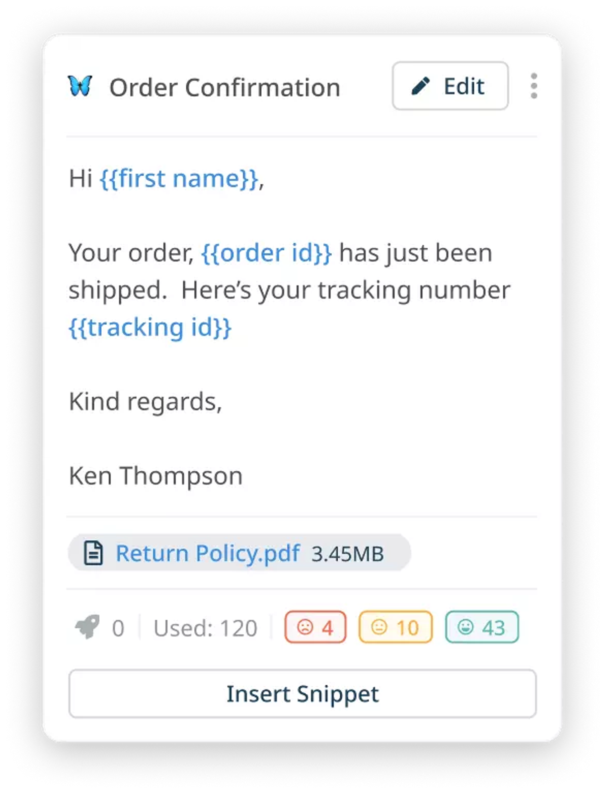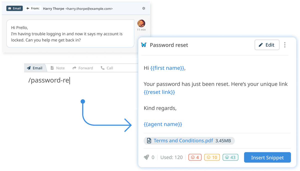 Agents can also use snippets without having to access the interface; quickly insert canned responses by typing a designated shortcode directly into customer replies.