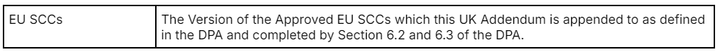 | EU SCCs | means the version(s) of the Approved EU SCCs which this UK Addendum is appended to, as set out in Table 2, including the Appendix Information |