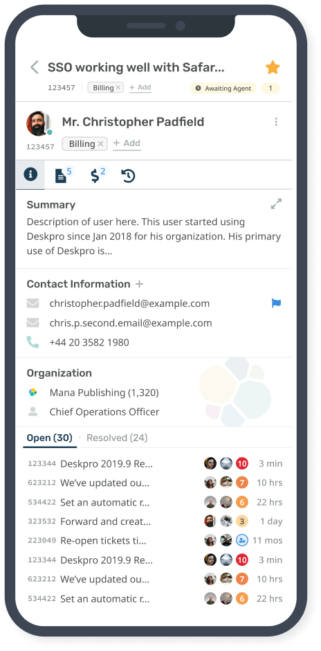 Deskpro apps make it simpler for agents to use on their phone, but still provide your team with all of the tools that they need to succeed.
