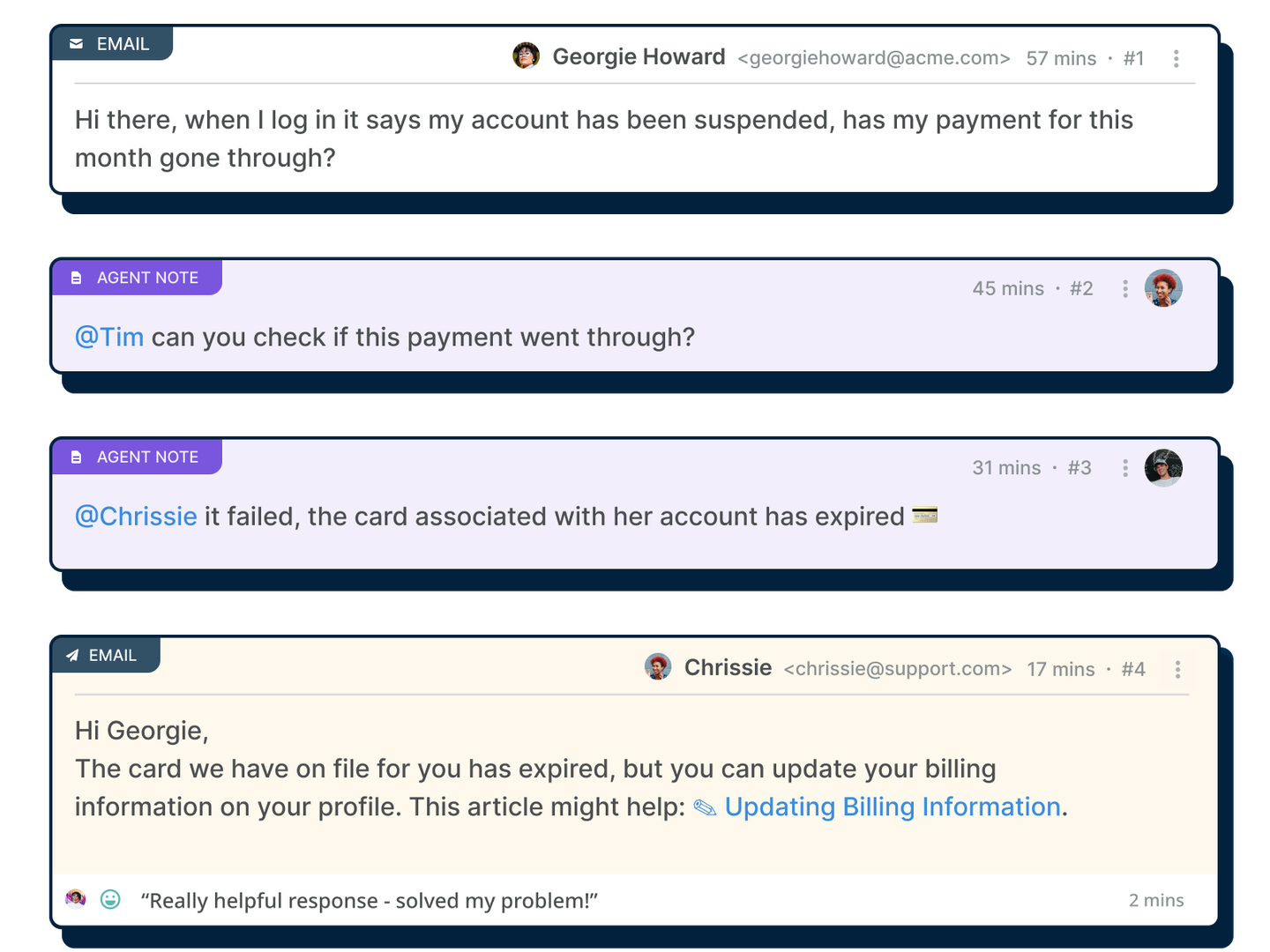 Remove confusion around who responded to what, when, and how. See the whole conversation with customers and prevent duplicate responses.