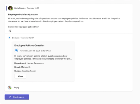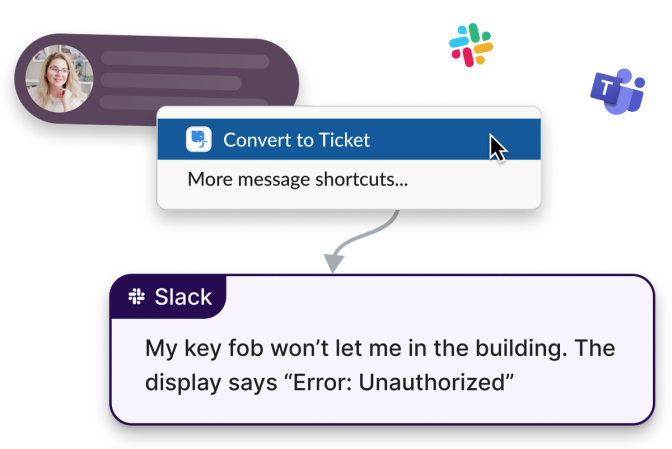 Raise tickets from Slack and Microsoft Teams to simplify support and improve collaboration effortlessly.