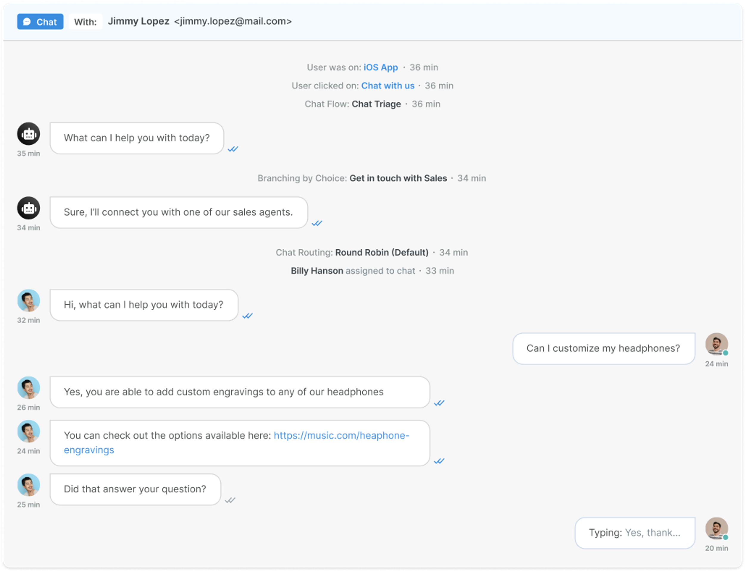 See what customers are typing in real-time before they press send. Your customer service agents can find an answer whilst they type and reply faster. And identify a customer’s sentiment by seeing what they delete, as well as what they send.