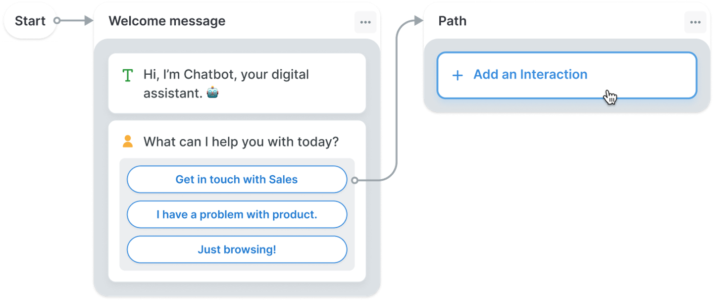 Create pre-defined chat paths, where a user’s selection determines the next step in the conversation, whether you route queries through your chatbot or directly to an agent.