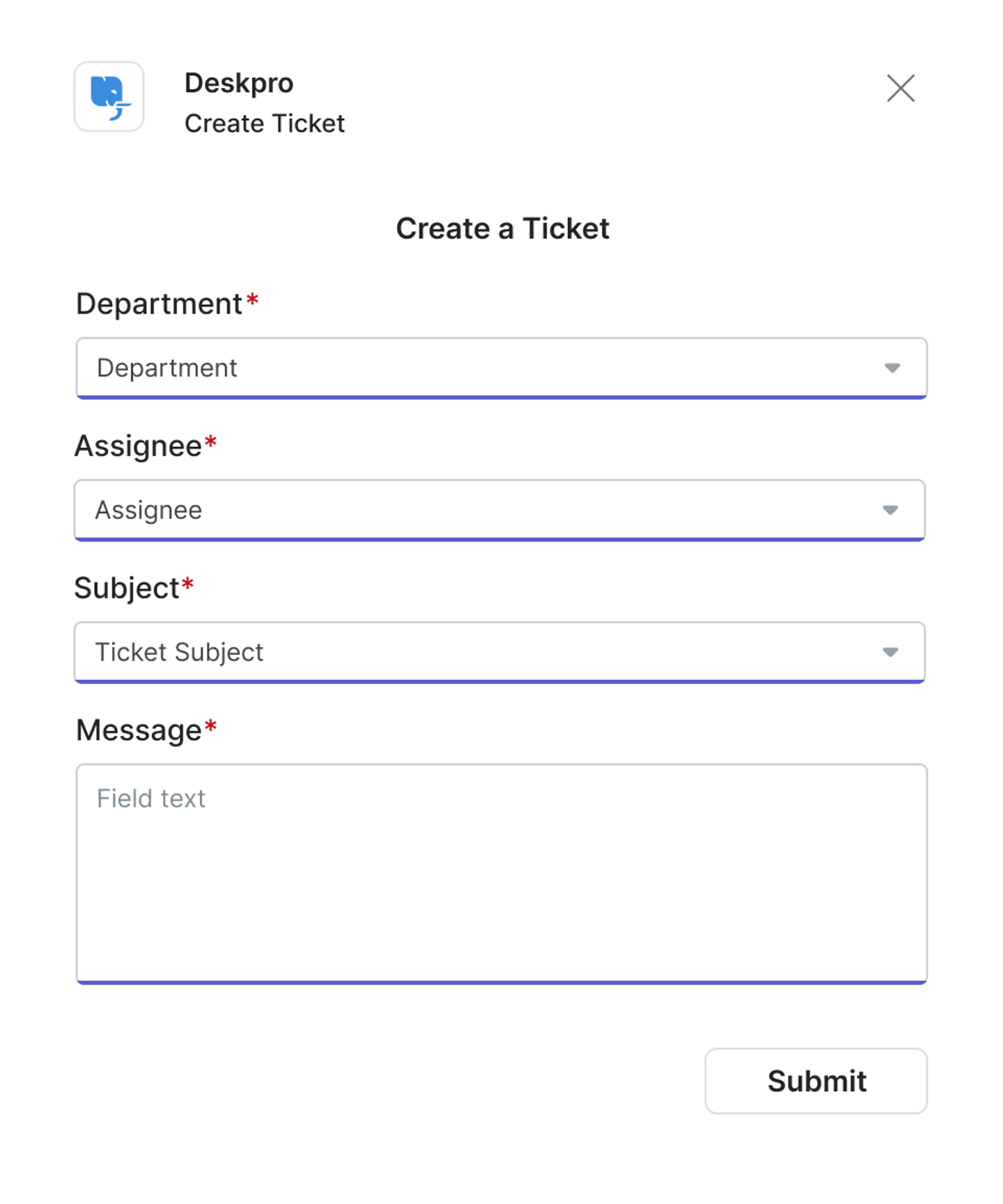 Create a ticket from any chat or channel. Just click, describe the issue, and submit.