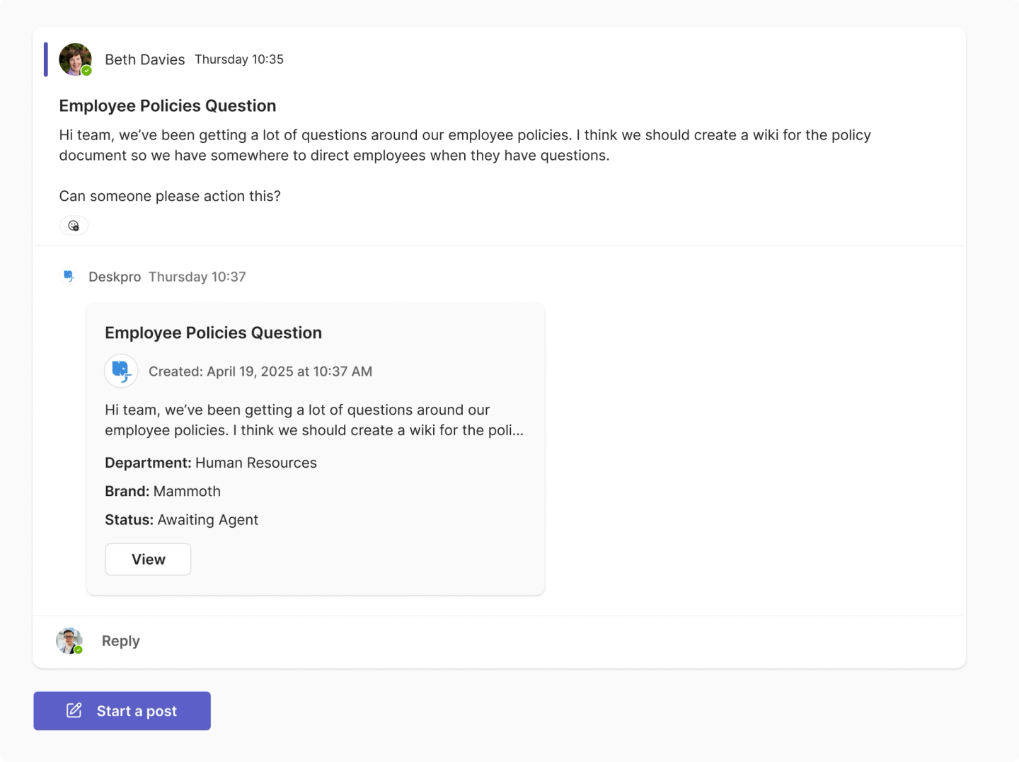 Agents can view, respond to, and resolve tickets created inside Teams, reducing delays and improving first-response times.
