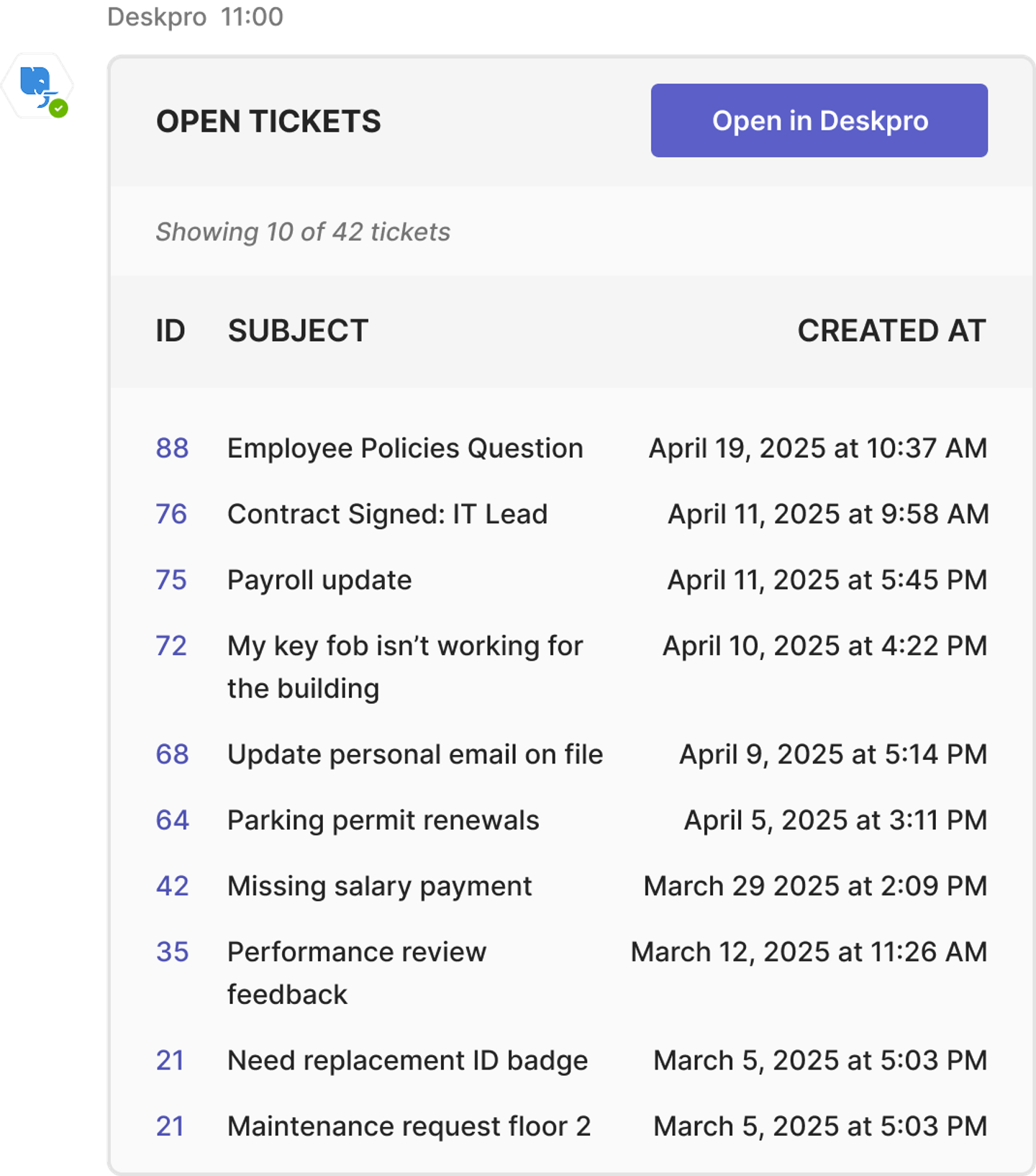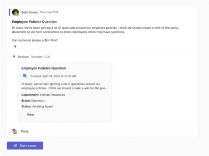 Deskpro brings your help desk into Microsoft Teams, letting staff raise, manage, and track support issues without breaking their workflow.