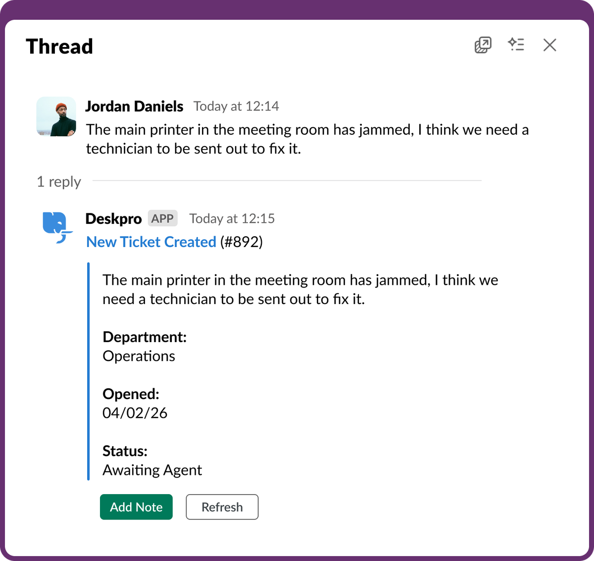 Requesters don't have to leave Slack and your team never miss a message.
