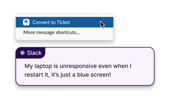 Let your people submit tickets inside Slack, making requests easy to find, track, and resolve.