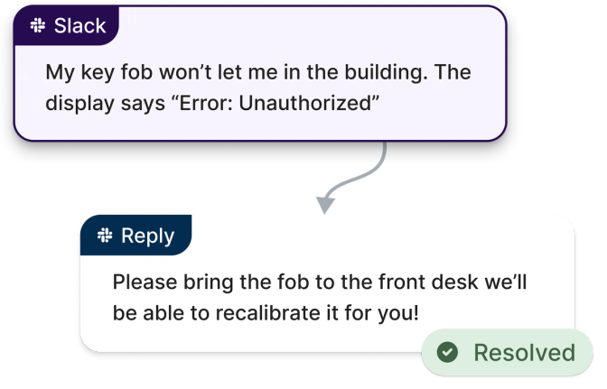 From AC issues to supply requests, report problems instantly in Slack and keep things moving.