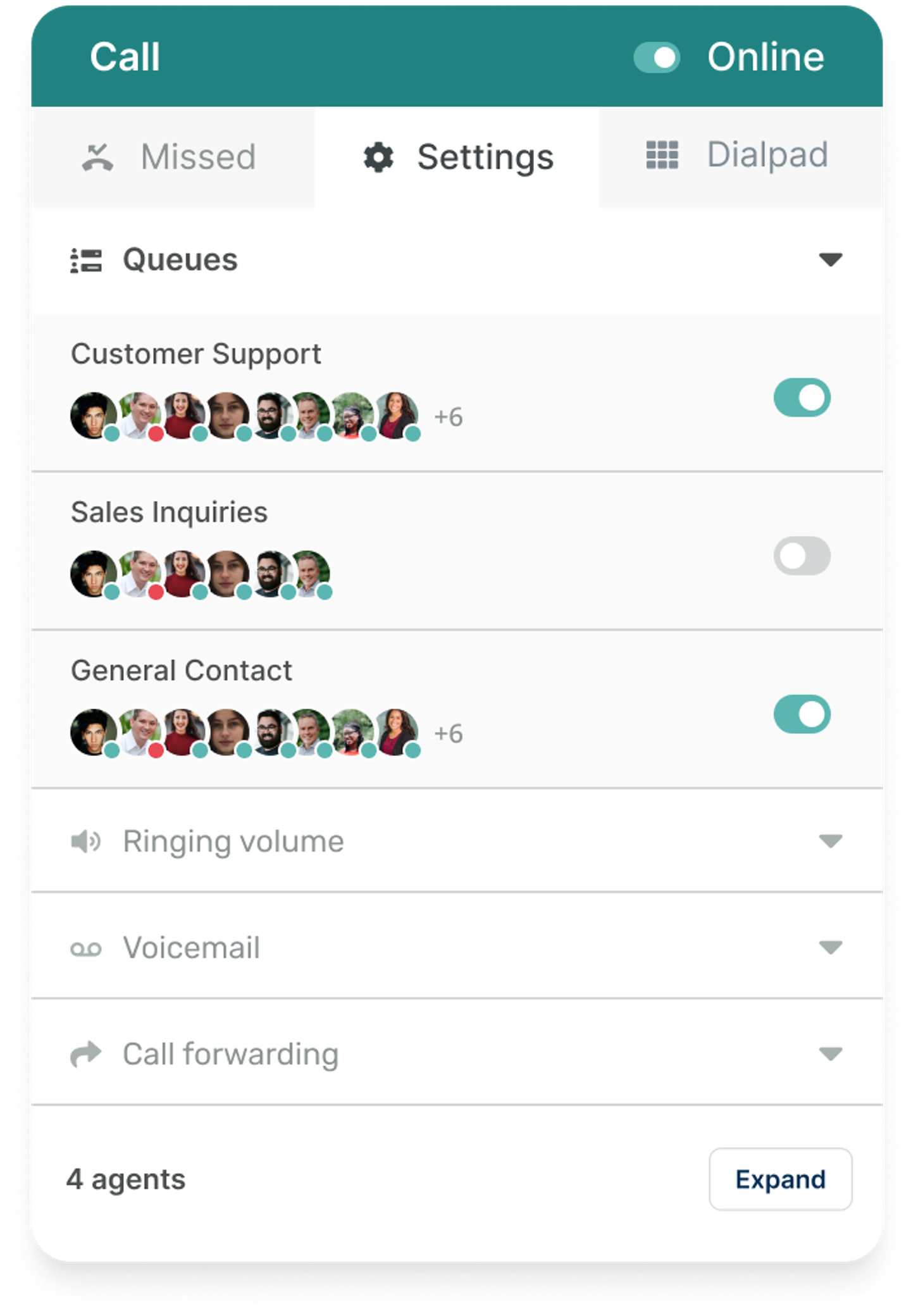 From the dial pad, agents can make outbound calls or call the SIP address directly. They can also choose which phone number to call from.