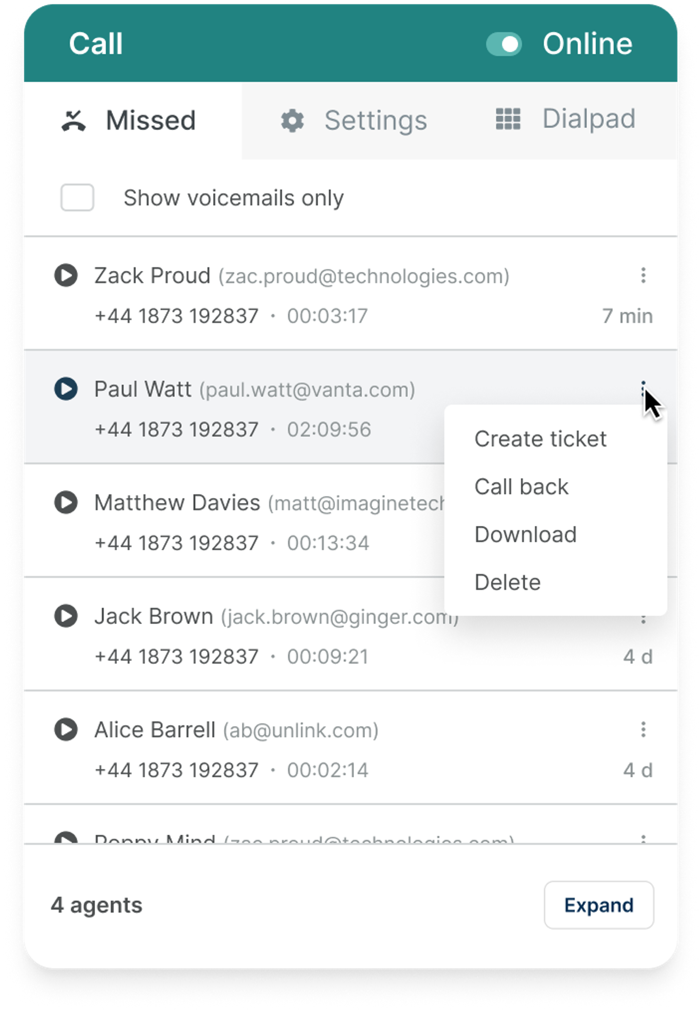 If you don't have a 24/7 call center, voicemails are key. Voicemails can automatically create tickets and appear for agents in the voicemail section of the Voice app.