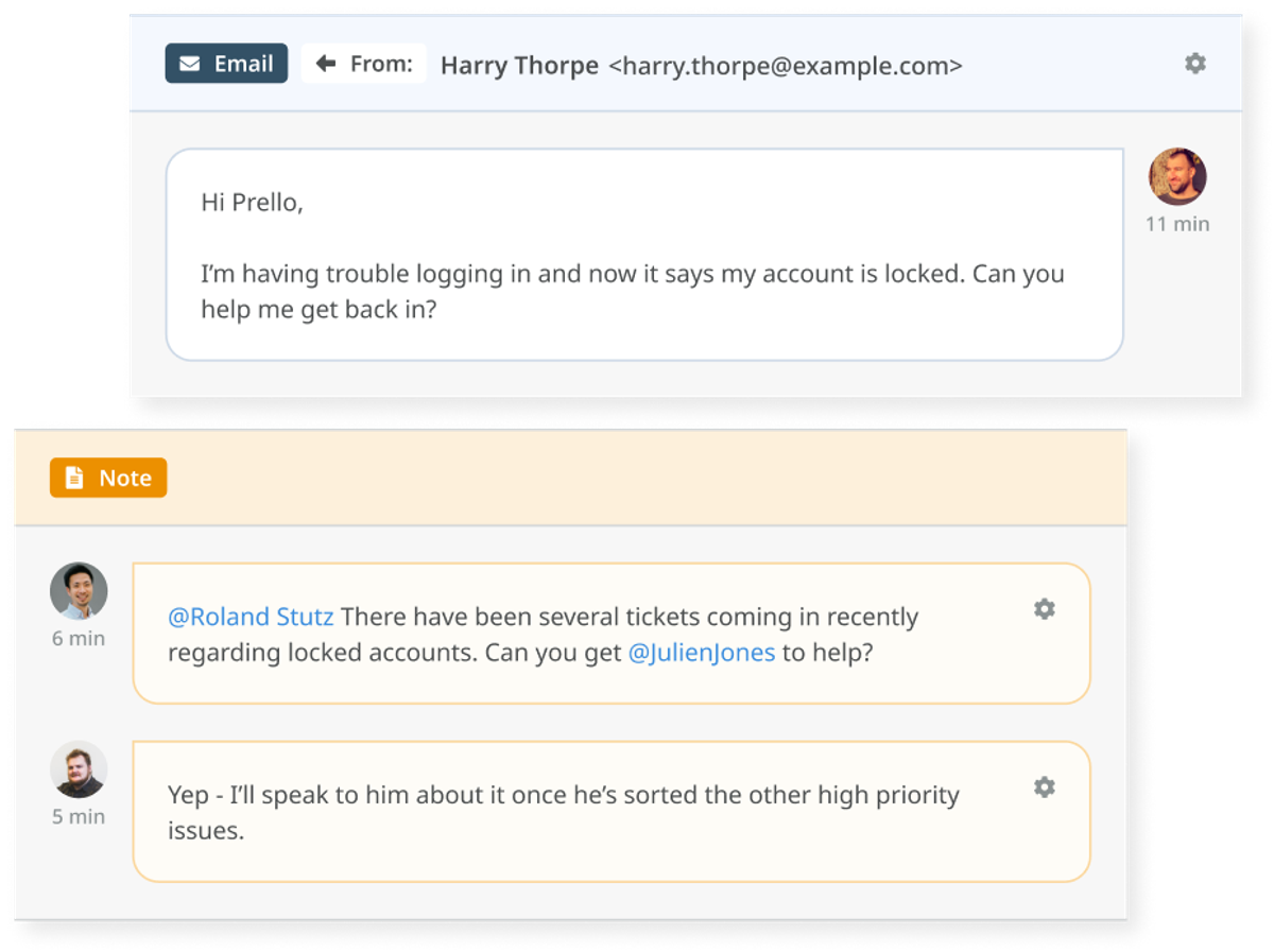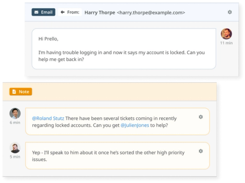 Agents can use @mentions to ask for help, discuss, and make support decisions all within a single ticket protected from customer view. Notes aren’t included in messages, meaning you don’t share private internal communications outside your help desk.