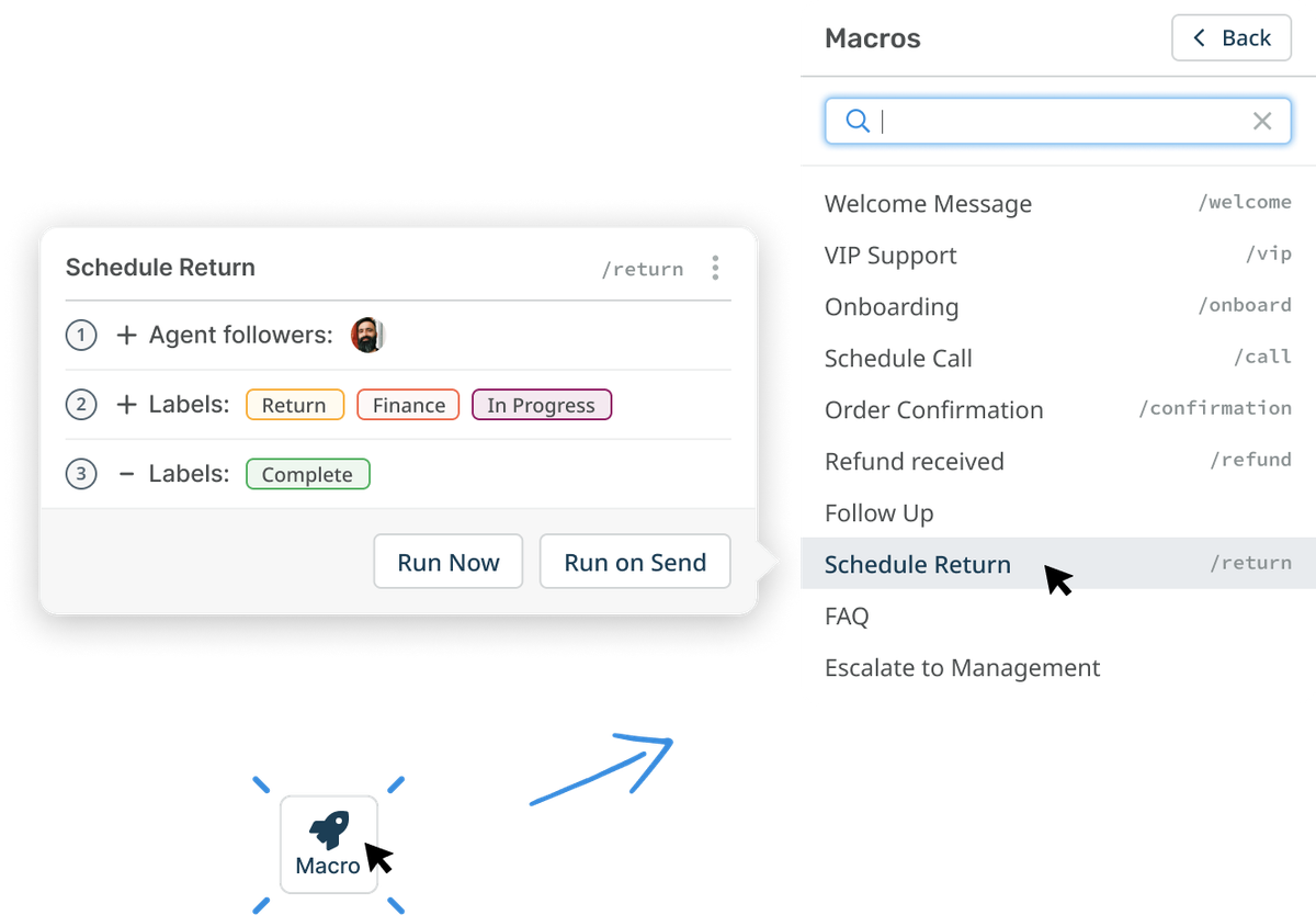 Eliminating unnecessary actions and processes is one of the most effective ways of improving efficiency and agent engagement. If your workflow requires agents to carry out the same actions across many tickets, you can automate the process using macros.