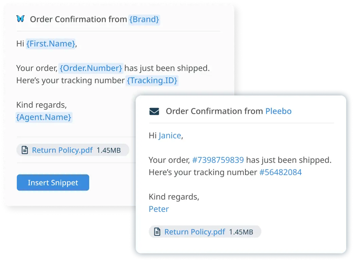 With Deskpro, agents can effortlessly craft perfect responses every time with canned responses, which allow your agents to insert pre-written phrases, sentences or complete "Snippets" in just two clicks.