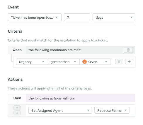 Increase ticket urgency, re-assign tickets, or send survey requests after tickets have spent a defined period of time in a specific state.